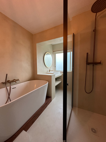 🎨 Revêtement en béton ciré du sol aux murs, pour un rendu élégant, moderne et 100 % étanche.